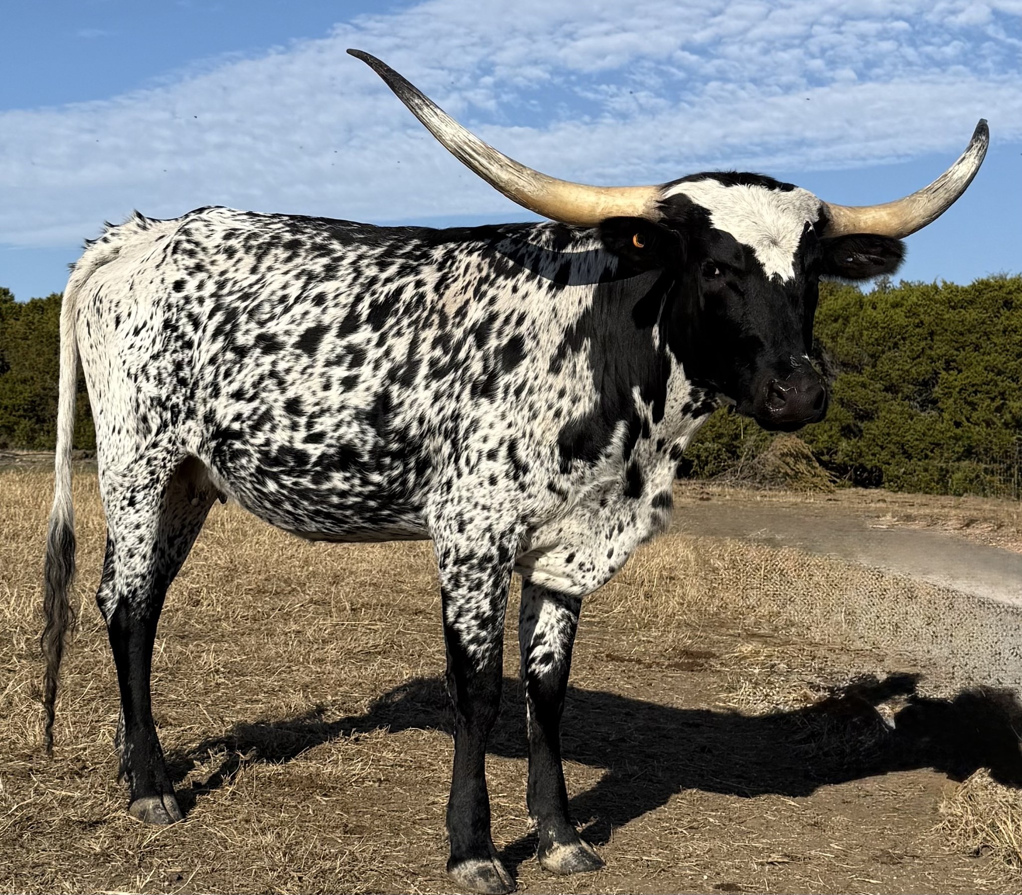Smoke brings the heat with her fabulous black and white speckled coat, EDE+ (dominant black/wild genes), horns heading flat back and winsome demeanor. And she's BIG! Supermodel of the pasture!! Knock-out Rebel HR X Barn Dancer genetics have produced one hot girl!